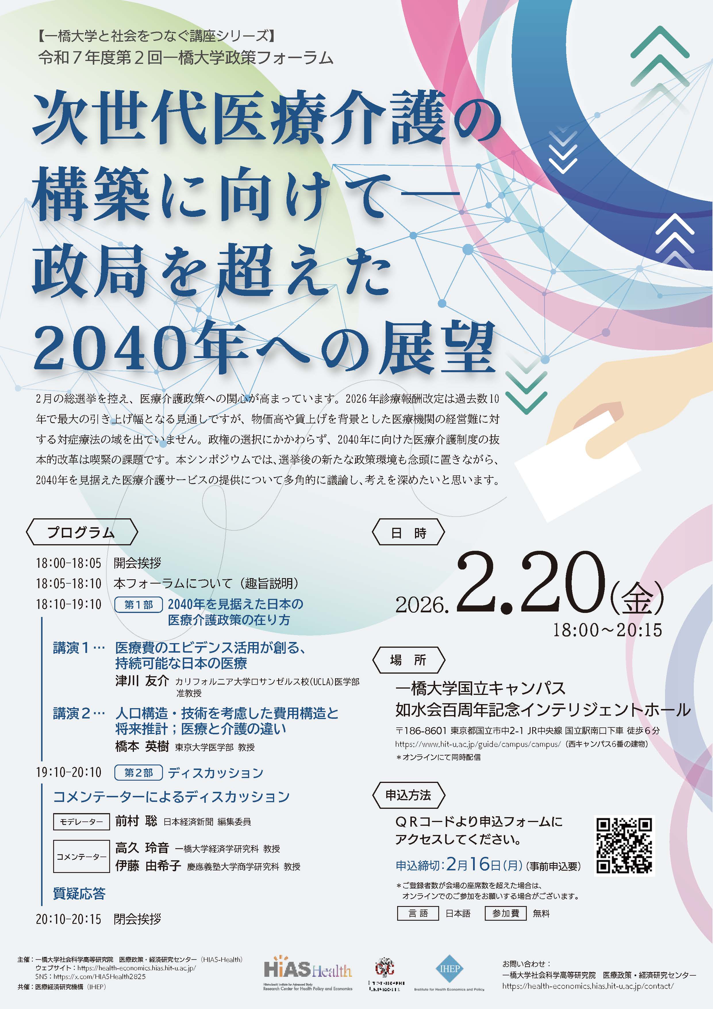 「次世代医療介護の構築に向けて―政局を超えた2040年への展望」 <プログラム> 18:00- 開会挨拶 18:05- 本フォーラムについて(趣旨説明) 18:10- 【第1部】 2040年を見据えた日本の医療介護政策の在り方 19:10- 【第2部】ディスカッション 20:10- 閉会挨拶