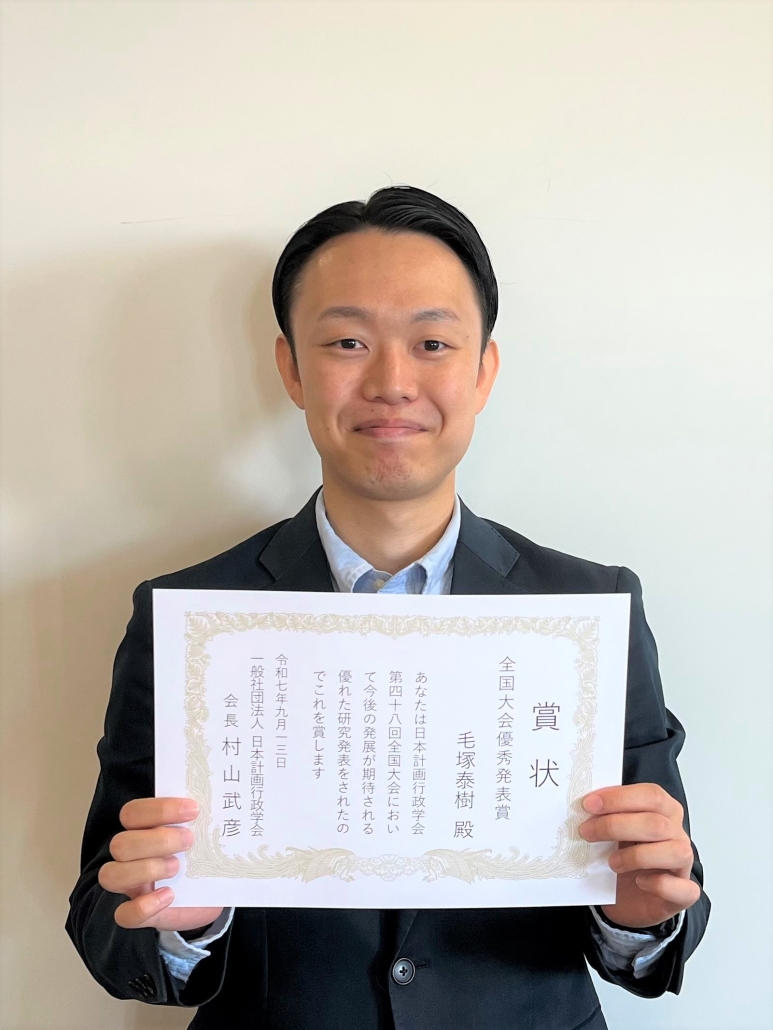 2025年9月12日~13日に宮城大学で開催された「日本計画行政学会第48回全国大会」において、SPRING事業支援学生の毛塚泰樹さんが優秀発表賞を受賞しました。